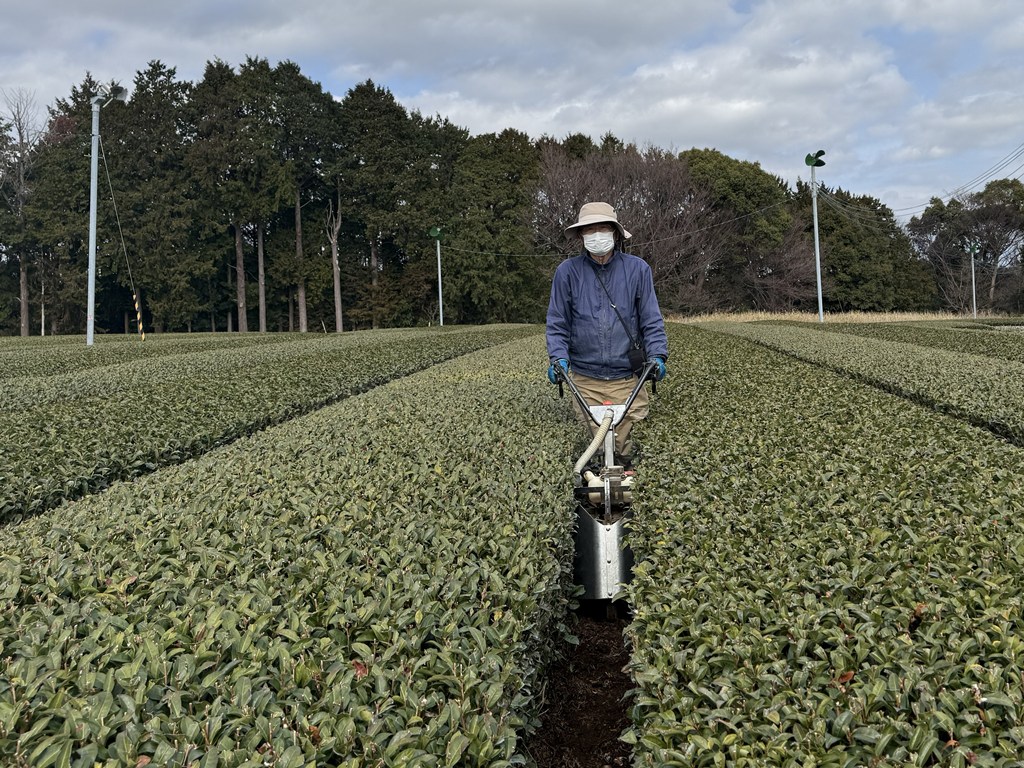 3月6日:クランクカルチ 茶園へ化成肥料を施しました。その後、クランクカルチで茶樹の畝間をおこして土を混ぜます。
