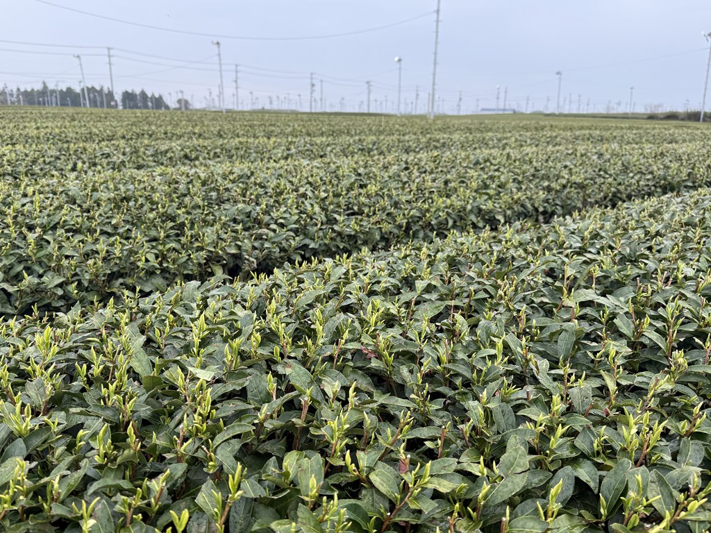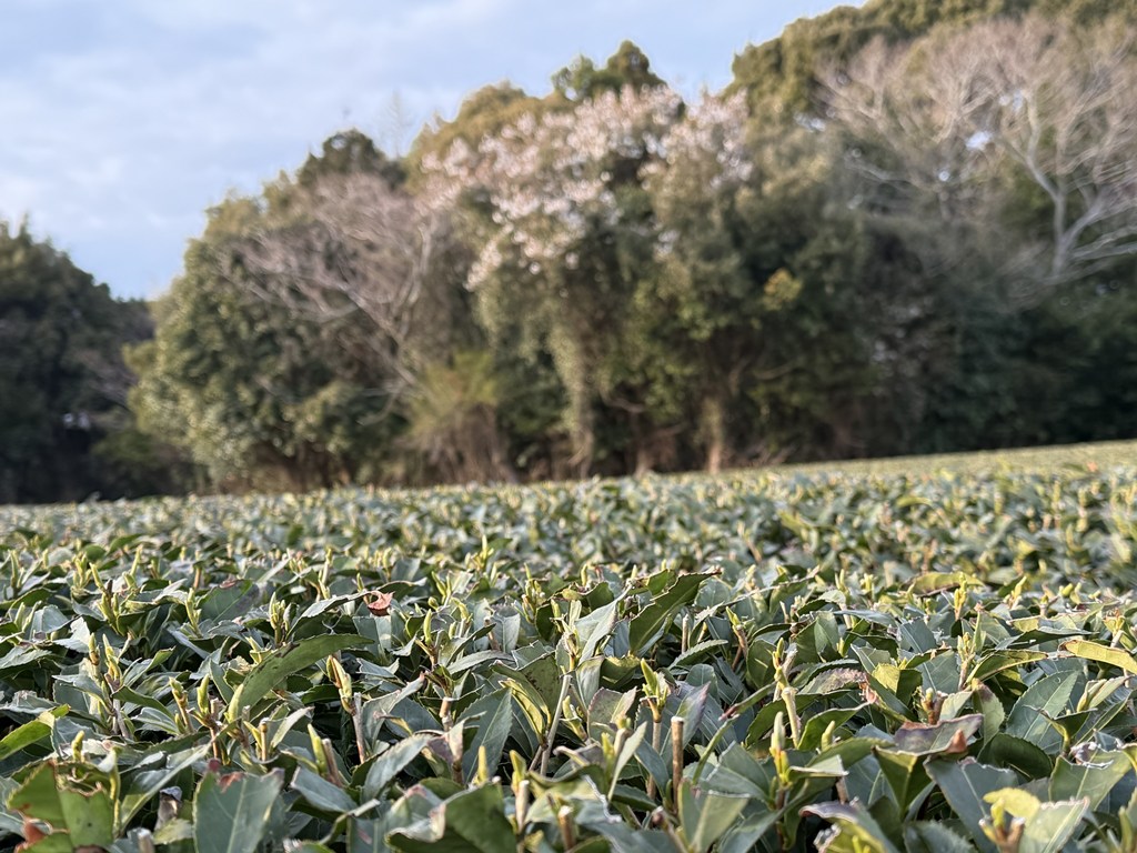 4月1日:お茶の新芽と桜 牧之原台地では、お茶の新芽が膨らみ始めました。 勝間田川堤の桜も感化しました。